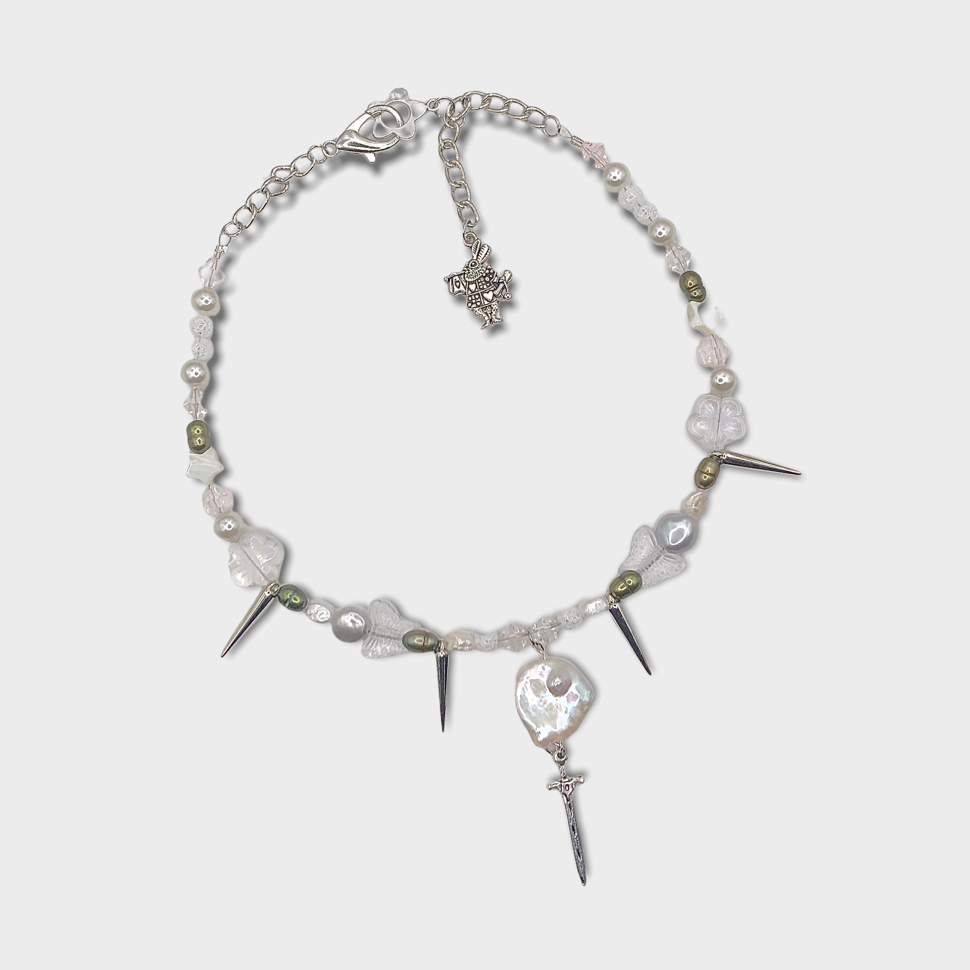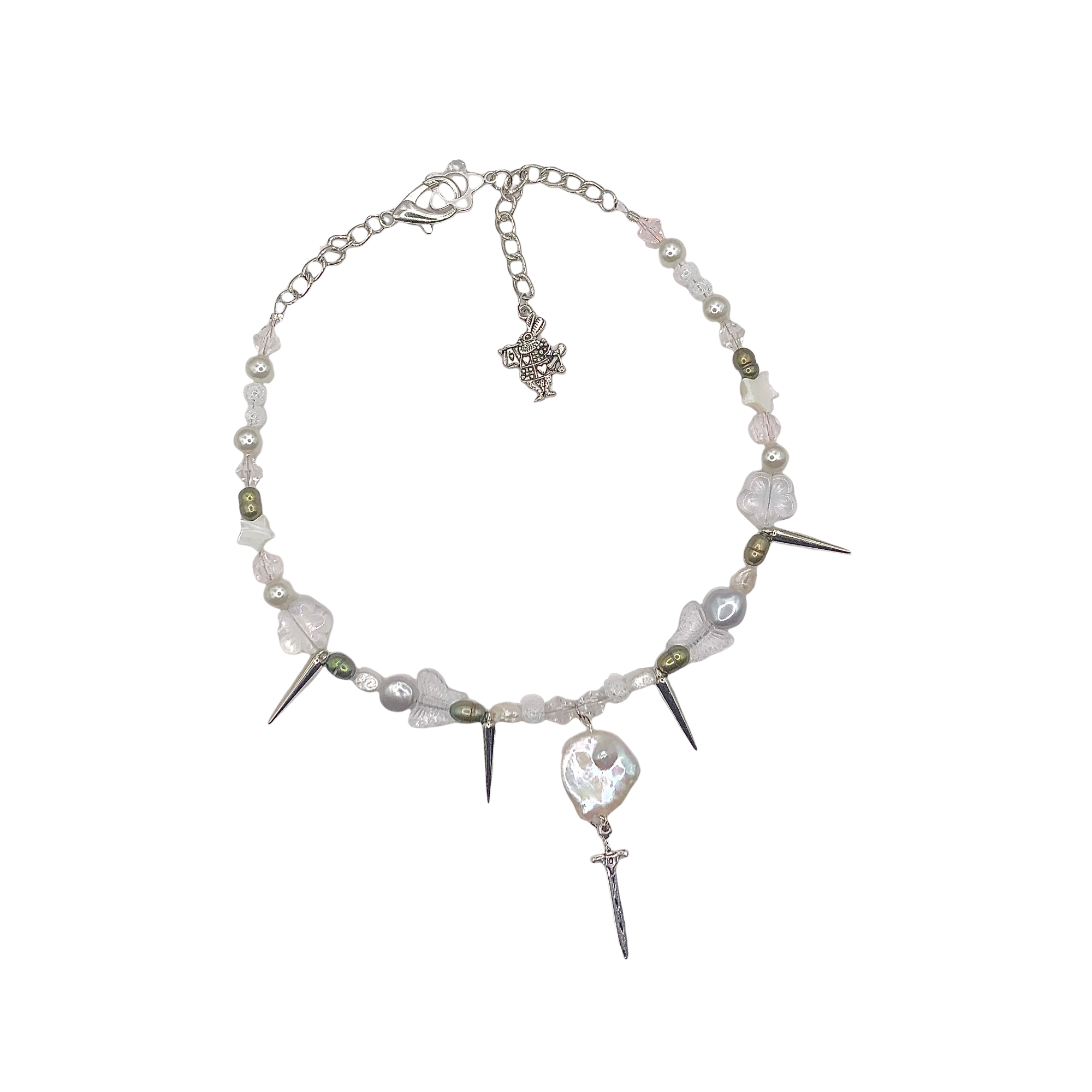 freshwater pearls, stainless steel, faceted glass, rare baroque freshwater pearl with hanging sword pendant